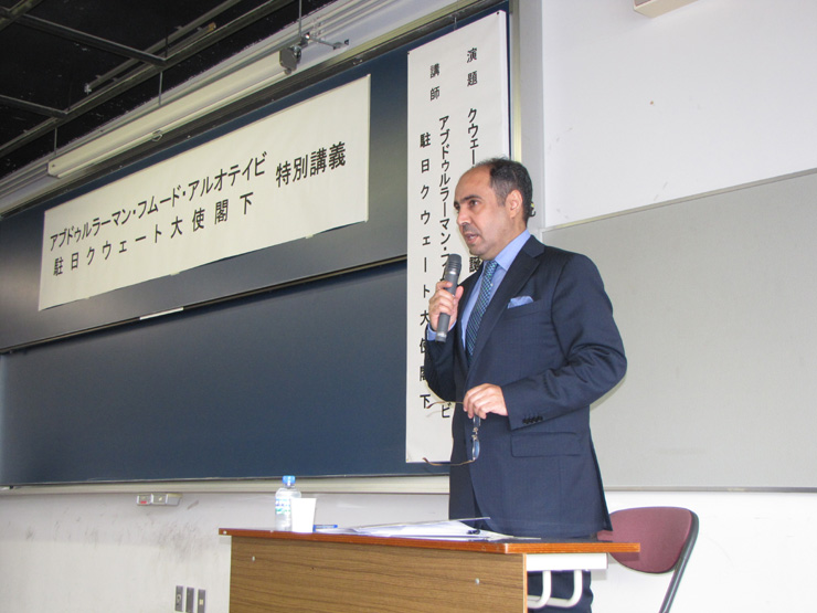 There was also review of the diplomatic relations between the two friendly nations which date over five decades. The level of relations was evident and further bolstered through the visit of His Highness the Kuwaiti Amir Sheikh Sabah Al-Ahmad Al-Jaber Al-Sabah on invitation of Emperor Akihito in March 2012. The invitation came after the devastating quake and tsunami of March 11, 2011 and Kuwaiti support in the aftermath and reconstruction effort. On the financial support to Japan at the time, the Kuwaiti ambassador stressed it was a natural reflection of the close bonds between the two people and countries and is also a means to repay Japan's support during the 1990 Iraqi occupation of Kuwait. Following the lecture, the ambassador welcomed students' questions, and there was special interest in Kuwaiti plans to employ nuclear technology, especially in view of the Fukushima disaster. There was also interest in horizons and potential of cooperation in water desalination technology, and general interest in Kuwait and in visiting it in the future.